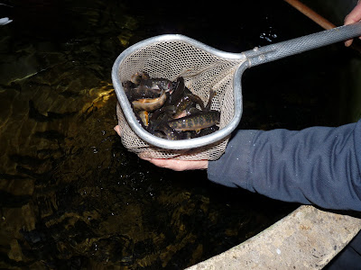 The hatchery building is a modest, even slightly ramshackle looking cement block structure with a tin roof. It was build in 1962 and ran until 2006 under the original owners. The next generation didn't really want to farm fish though, so in 2008 Bruce Green and Sean Brady bought the operation, and began again basically from scratch. There were only a handful of fish remaining in the ponds. As of April, the hatchery has been in operation again for 2 years.