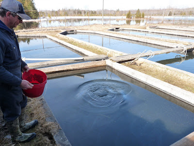 The fish are fed an organic feed from B.C., but this is supplemented by the large amount of small aquatic life that comes in with the spring water; mosquito and black-fly larvae,