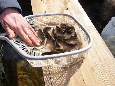 Bruce shows us some of the young trout. These are speckled trout, about 13 to 14 months old. There are about 10,000 of them in the tank, which seems a staggering amount but they are still small enough that they have plenty of room to swim around.