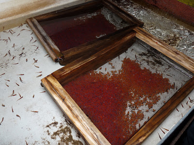 You can see water trickling into the table-top tank in the top right hand corner. It ran out the other end with the same steady trickle. The whole indoor part of the hatchery had the scent, sound and air quality of a shady forest stream bed. It was a surprisingly pleasant place to be.