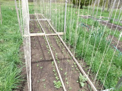 The trellises now have braces along the bottom as well as the top, to hold the strings. Last year we just attached them at the top and let them hang down. This worked well for a while, but as soon as we had some windy weather (i.e. not long) the peas caught the wind and and the whole mass of vines would shift and end up hanging mostly over the paths.