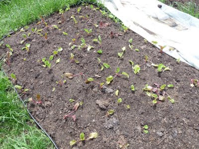 We tried starting a lot of greens inside, early, this year and they were mostly a failure. The one thing that seems to have made a good transition to the garden is the chard. We had it under the hoop house for a little while, but it is getting warmer and it seems to be settling in nicely, so it's been exposed to the elements for at least a week now. The leaves it had when it was planted are going to die off, but it is definitely forming new ones so while it doesn't look all that great I think it is actually fine, and we should have Swiss chard at least a month ahead of last year, in spite of the much slower start to this season.