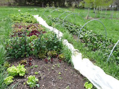 Right now lettuce and spinach are still going strong from last year's fall planting under hoop houses. However, they will have to be pulled right around June 1st and replaced with the melon, cucumber, squash and tomato plants that are growing in pots inside right now.