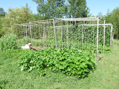 These are both pole beans, and we agree with the common wisdom that they are better than bush beans. Pole beans are indeterminate (they will keep producing until frost, if not done in by drought) and the flavour is generally better. I think it's because there is a lot more plant to support the beans; they don't just rush to churn them out then die. Of course, you have to build a support of some kind for pole beans, but the trouble will be more than paid back when you go to pick them - so much easier on the knees and the back. And I have to say, one of this summers' pleasures has been standing between the two beds of pole beans, with big green leaves waving gently on either side. They are very beautiful plants. I can't say I noticed the Fortex flowers, but the Blue Lake flowers are a pretty butter yellow. We will still grow a few bush beans next year I think, but just enough to get an early crop before the later pole beans start.
