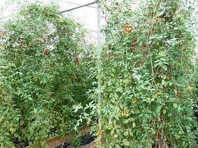 I was very impressed by their cherry tomato plants. Even outside, they do get big, but these must have been 9' high as they had reached the ceiling. The tomatoes are obviously winding down, but they were still large and impressive.