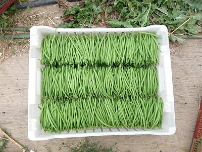 They had spent the morning picking beans before the rain got started. These beautifully sorted beans were for another purchaser, who supplies to the restaurant trade. They were perfectly sized and arranged with all the stem ends together, and the farmers sold them for 4 times as much as Robert pays for his beans, in unsorted sizes and higglety-pigglety. I imagine they were four times the work to pick, though.
