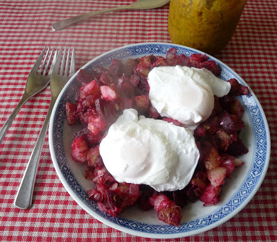 Here is a fine old dish. The name comes from the way the beets bleed all over the potatoes, like a red flannel shirt that got mixed in with the white laundry by mistake. It's always been delicious, but I added some fennel seed and cayenne and thought it was better than ever. The poached eggs are classic, and really make it a complete meal. The two of us ate it all, since we are apparently under the impression we are lumberjacks, but if you have a more modest appetite or serve it with other things, it will serve four. The stuff in the jar is my home-made chow-chow, another classic old-timer of a recipe. Ketchup would also go just fine.