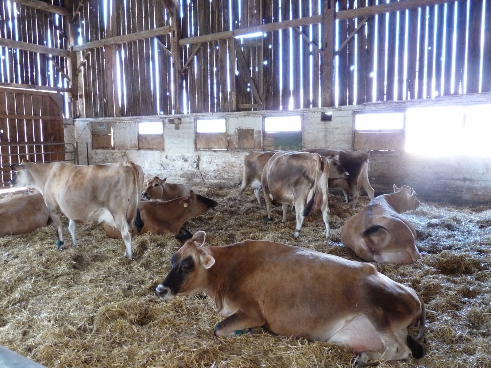 A milk-producing cow is milked for about 1 year before she runs dry. At that point, she goes back into the dry-cow herd, and remains dry for about 9 months. A typical Jersey can expect a career of about 12 years. The milking cows live in a large, airy and very open barn, but don't go outside. At one point they had that option, but so very few of them ever went out that now they just keep the gates closed. I guess it's a lot of work hauling around 30 litres (kilos!) of milk!