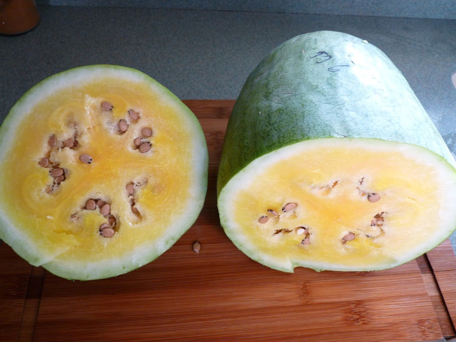 This one (PJ006-0906) was in many ways the best of the year. At 10.5 pounds, it was perhaps a shade on the large side - not the worst problem ever - but it had excellent colour, the best flavour of any from this project, very decent texture, and held up well in the fridge. It was big enough that I think it was in the fridge for close to 2 weeks before we ate it all, so it held up really very well. The only thing I didn't like about it was the seeds - they were pale and spotted like the Orangeglo parent's seeds, and fairly large and more abundant than I like to see.