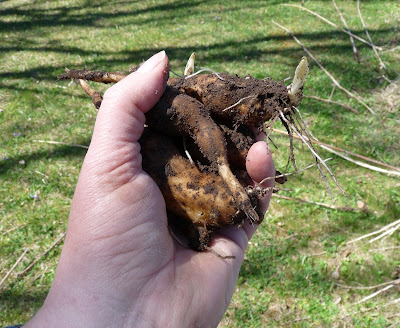 Two years ago we planted some Jerusalem artichokes, and they have been growing in the garden ever since. After the first summer we poked around and were underwhelmed by the number of apparent tubers, so we left them along for another year. Last fall we were too distracted to try to dig any up. However, we expected we could dig some in the spring.