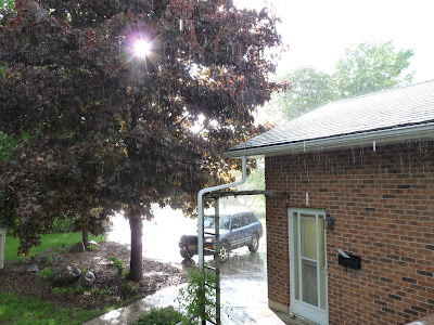 Okay, I haven't actually said much about drought measures in the garden, have I? Here's one of them. We are acquiring 2 litre pop bottles, by fair means and foul (by drinking club soda and performing garbage night blue-bin raids). The bottoms are cut off, and the capless bottles are then planted head-down near to a plant or several, so water can be directed right to their roots, avoiding wholesale scattering of water and excess evaporation. Works quite well, but only on the larger plants. Onions, carrots, peas and beans, etc, are too small and close together. They are better watered with soaker hose laid down shortly after they come up (i.e. before they get too big to get it in without damaging them).