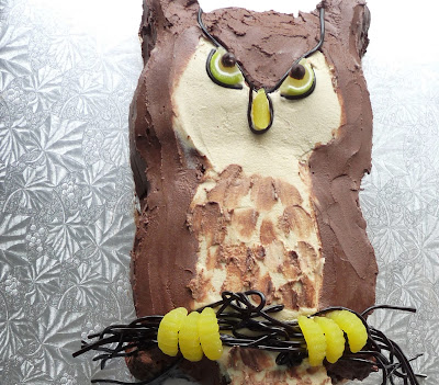 My cake decorating skills are most kindly described as rustic, so I decided to go with it... you can't get much more rustic than an owl. This is made with 2 8" round layer cakes (4 layers in total - 2 batches of the cake).