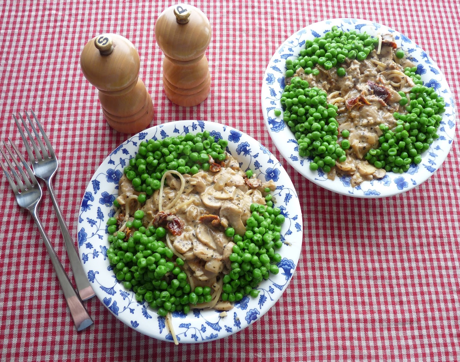 I didn't bother adding any chicken, but you could - a chicken breast or so cut into bite sized pieces and cooked with the shallots should do the trick. I served it with green peas frozen from our garden, but any green veg you like will finish off the menu.
