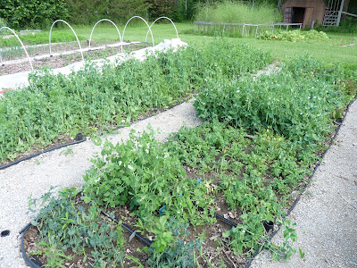 Above are peanuts, looking okay from a distance. They are not actually doing too badly in spite of having been nibbled by marauding rabbits. It has been cool enough and wet enough we expect to keep them covered off and on all summer, hence the hoops and plastic to go over them.
