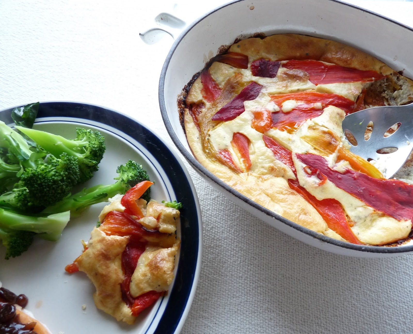 Pull out the stems and cores of the peppers, removing all the seeds. Peel off the skins. It can be helpful to rinse the peppers under cold water to remove the last bits. Cut the peppers into strips or chunks and lay 2/3 of them in a lightly oiled baking dish that will hold them in a single layer but fairly snugly.