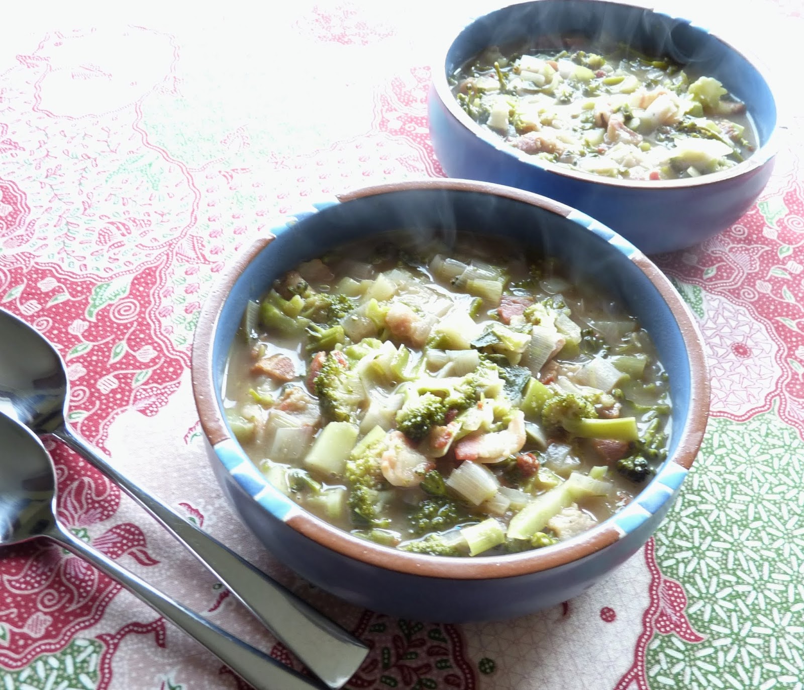 Leeks and bacon are a classic combination and broccoli works well with them too. Leeks are so sweet and agreeable they get along with everything, really. Toasted barley as my favourite soup thickener, and a little vinegar and Worcestershire sauce to sharpen it up, and it's a sturdy, filling soup for chilly fall days. It will need a little something on the side, though, as these are not huge servings. We had ours with a grilled cheese sandwich and were very happy campers.
