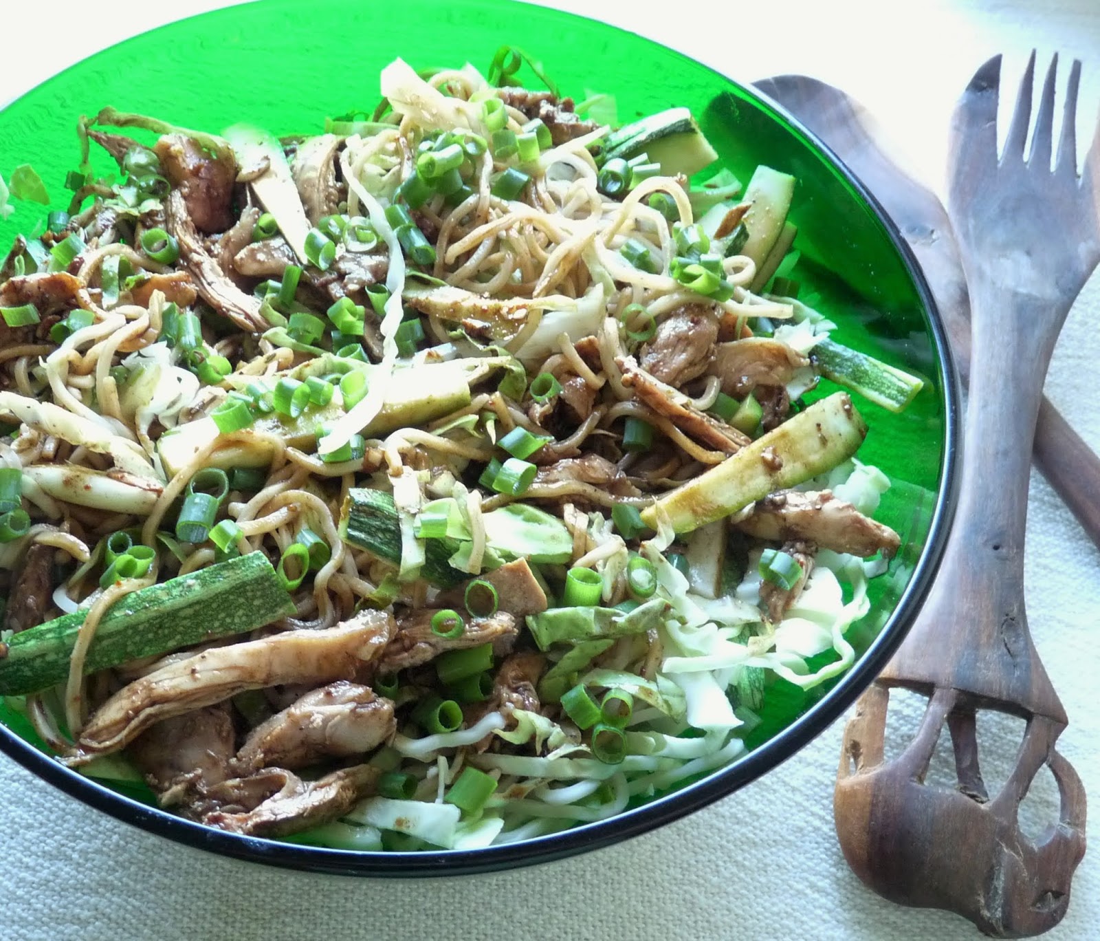 Pour the boiling water from the cooked noodles over the salted zucchini in the strainer, thus blanching them, and dump in the noodles on top to drain. Rinse well in cold water until cool, then drain very well. Put the zucchini and noodles into a large mixing bowl with the other prepared vegetables. (You may wish to save a bit of the green onion to sprinkle over the top.) Toss with about two-thirds of the dressing.