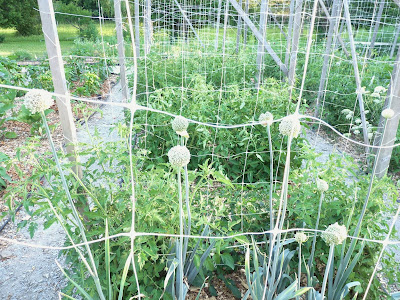 Mr. Ferdzy placed a spine of tomato cages down the centre of the pea beds, and they seem to have been helpful in keeping things upright. The Hatif d'Annonay have flopped badly though, and they look like dying down quite quickly. The dying down would be fine, if they are to be pulled and replaced; the flopping is a bit annoying.