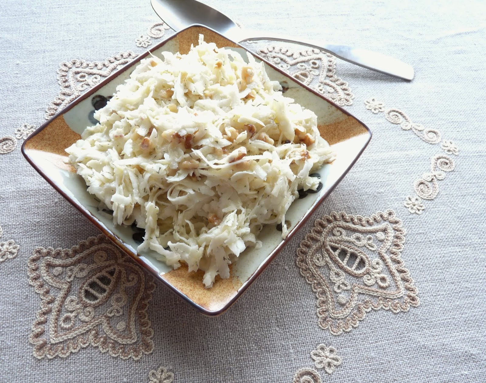 Add the mayonnaise, yogurt, salt, pepper, dill, and walnuts and mix well. Drizzle the olive oil over the salad and mix in gently. Transfer the salad to a serving dish and serve.