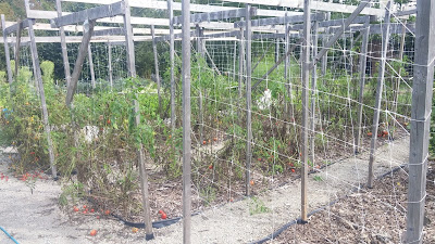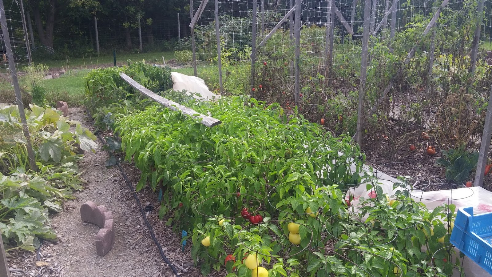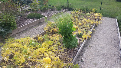 Tomatoes have been kind of over for a while. We've done all the canning we intend to do, and the nearer tomato bed has been cleaned and had the trellises taken down. We've replanted the bed with garlic. Normally we only plant two-thirds of a bed of garlic, but we decided we are not growing enough garlic and planted the whole thing. Yes, we use (and share with Mr. Ferdzy's brothers) a lot of garlic! Cucumbers and zucchini are pretty much over due to powdery mildew, as usual. I still have to pull them though.