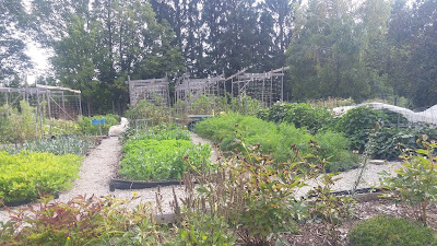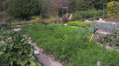 This section still looks pretty much as it does in the photo above, perhaps a little less lushly green. But we haven't pulled carrots, or sweet potatoes, or peanuts, or the turnips or beets. Those leeks in the mid right frame should have been onions but I mixed up the seed and for some reason the leeks really dominated.