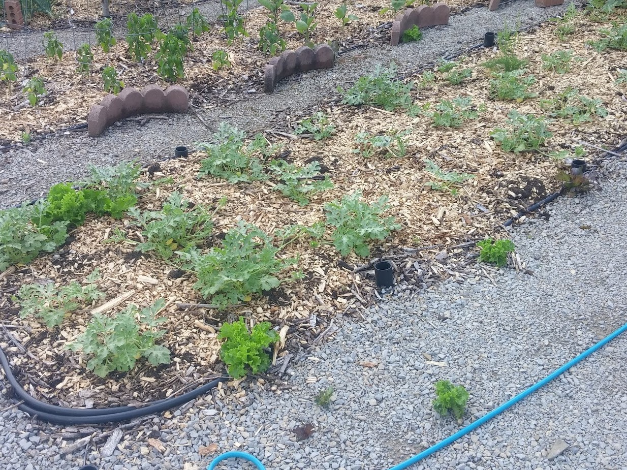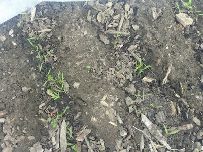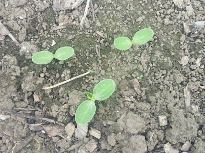 Immediately after our big rain, the watermelons went from "doing okay but sitting there" to sending out vines. This is the 5th - I think - year of growing out the golden rind cross and we will be watching these with interest.