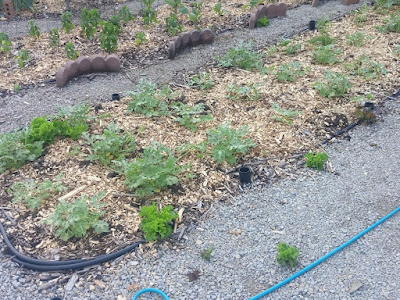 Over in the leaf section, the spinach is way over and the lettuce is getting bitter and bolting. I'm hoping some cooler weather following the big rain will keep it usable for another week, but it's time to thin and replant, leaving a bit to go to seed. Brassicas are doing terribly. They went out looking small but nice, but some critter has been eating the hell out of them. Snails? Chipmunks? We do not even know, but popping half a pop bottle over them seems to be keeping them safe for the moment, so we are reseeding where they have been destroyed and covering the survivors.