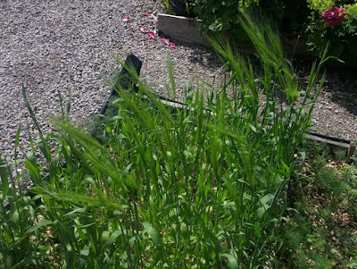 The barley is starting to form seed heads! This is the Dango Mugi barley. It is probably doing the best of the 4 types we planted, which is mildly a pity as I wanted tall barley straw and it is somewhat short. I will be watching the barley carefully because I suspect it will be a tug-of-war to keep it from the critters.