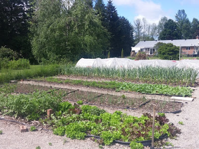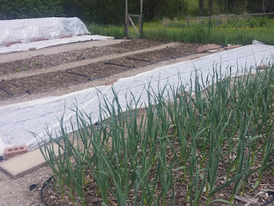 Another view back at the root beds - potatoes and beets in the first bed, along with a little (hah) self-seeded lettuce, which will need thinning, hopefully this afternoon. Then the onions, carrots and rutabaga, garlic, and since the rain brought in some chillier temperatures, the sweet potatoes got covered until it warms up again.