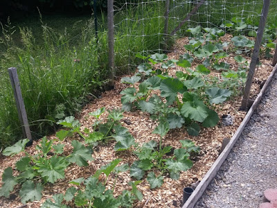 Zucchini, up to the post, with butternut squash beyond that first post. That monstrous large one is an interspecies cross, we are pretty sure, and as such we don't know what to expect, beyond monstrous large. Should be