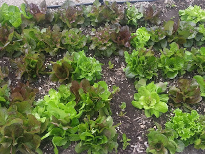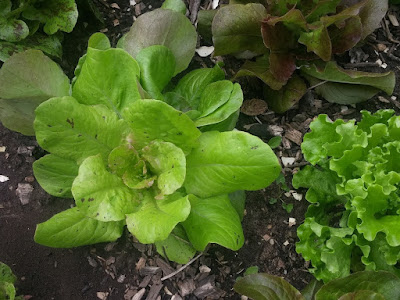 This one interests me, as it looks like a cross. That light green, slightly crinkled leaf form, brushed with a bit of a blush around the edges suggests May King. However, it's got little red spots, like several unnamed (well I imagine they're named, but I don't know what they are) types that we got in some mixed lettuce seed. I like the spotted types; they are often quite heat resistant.