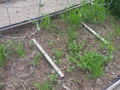 Behind them, we are keeping row-cover over the carrots, and also the rutabagas since they happen to be in the same bed. Onions and potatoes in the two beds beyond are still pretty much invisible to the naked eye.
