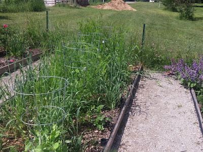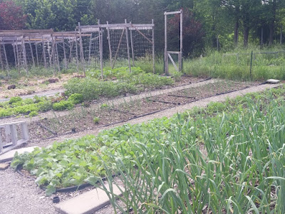 Our garlic looks magnificent this year. I'll soon be pulling some extremely nice looking rutabaga greens to thin them, and the carrots are doing very well. In the third bed over, the onions are... okay, I guess. We had serious problems with germination followed by serious problems with transplanting, but the survivors are starting to look like they will do. Beyond them, the potatoes are mixed bag. Actual potatoes are doing well, but transplanted seedling looked very promising for about a week before they started to dwindle. Something eating them, and it's not even potato bugs. I don't know.
