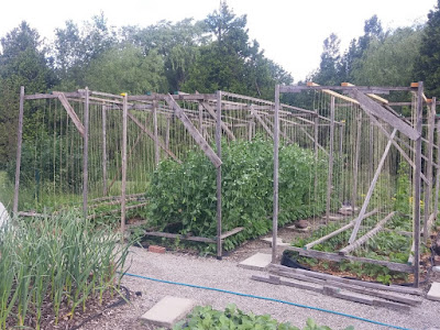 There's been some windy times lately, and the tall peas show the prevailing direction. We're starting to pick snap peas, and other mid-season peas are flowering and forming pods. Good, because the early pea beds are in full production and we hope to actually pull them out and replant beans in their spot within a week. Speaking of beans, the full-season pole beans are just starting to climb, but in general they look fine. They usually do, for about another month before the anthracnose really starts to bite.