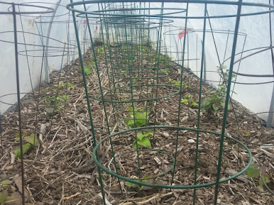 Under the covers here, are beans (vulgaris) and Lima beans. The Lima beans are the reason for the cover; regular beans should be able to take these chilly temperatures, if not actually like them. To the right, our early peas are in full flower - can hardly wait - and to the left, the first of three bean beds needing trellises has been trellised. The other two, including the currently covered Lima beans are still to be done.