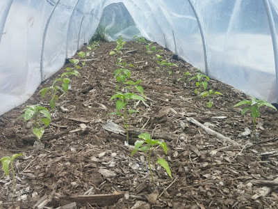 Peppers and eggplants (and tomatoes in two other beds) are also planted and covered for the moment. Mostly all looking pretty good, although the eggplants are struggling a bit with aphids. Seems early, but no doubt they are also a manifestation of this early heat. We've dusted everything in here with diatomaceous earth, which we hope will keep them down to a dull roar.