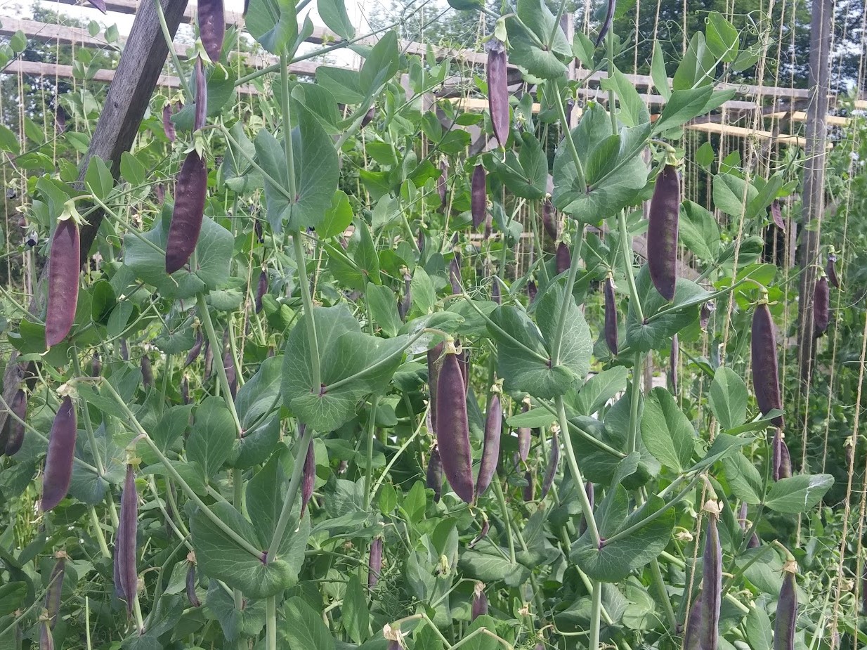 Our new pea trial of the year is the very pretty Lancashire Lad. The purple flowers and pods suggest that this was selected out of field peas. The purple pods make the peas easy to find, although once open the peas are a light olive green. They are smallish, and come 6 to 9 to a pod. We got them from Annapolis Seed, who says that they are also good dried for soup, but we have been eating them fairly steadily, and won't have enough to try that way. Unlike the other purple podded peas we grew, these have only a very faint hint of bitterness to them when raw, and it disappears completely once they are cooked. Their flavour is very good, in fact. It also turns out that they are quite early for a pole pea, and they filled in for a few days when the Knight had stopped and other, later, peas had not really started. They grew to about 6' tall, which makes them a tall pea, but not the tallest by any means. It's a little hard to say what their actual potential is, as the very hot and dry weather we are having is going to make this a short (both in vine length and duration) pea season all across the board.