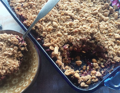 So... what have I not yet put into a fruit crisp? I know! It's peanut butter! And now I have, and I'll be doing it again, because what a good idea. This was entirely successful. Anyone who retains a fondness for peanut butter and jam sandwiches will like this very much.