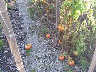 Since I'm not supposed to eat a lot of potatoes, we didn't plant any named varieties, only seeds and seedlings. The above beans are about half of the ones we saved from plants grown from seed this year. We'll see how they do at storing over the winter and try them again next year. As usual, most of the seedlings were discarded into the eating potato bin, but these ones seemed to be healthy plants with a respectable volume of potatoes already.