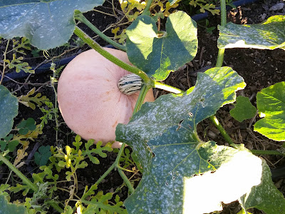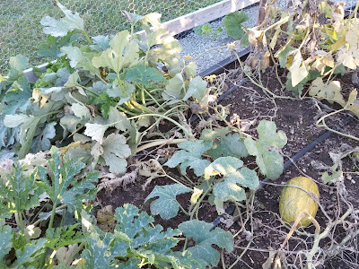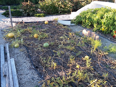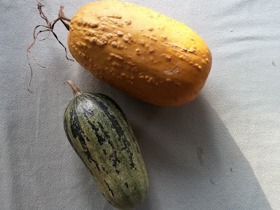 Two zucchinis did manage to get away from us, and we left them to ripen. The golden one is from one of the interspecies crosses, but unfortunately was a more ordinary green-fruited plant in the eating stage. The other one is a new variety we grew this year, called Jewel Green. I had no idea it was a very long, vining plant, and so it was easy to lose track of. No idea what it will have crossed with - usually multiple other plants - but I think I will save some seed and try it out. I'm less interested in the interspecies cross one, because it will be getting pretty diluted by now.