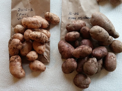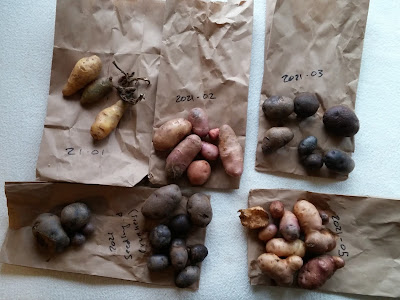 We are continuing to grow older seedlings as well. The one on the right, from 2016, was the only one that showed resistance to a virus that affected most of the others quite badly, stunting and yellowing the leaves. The potatoes were also in the worst bed in the garden, so the overall harvest wasn't great. It's fine! I'm not supposed to eat them anyway.
