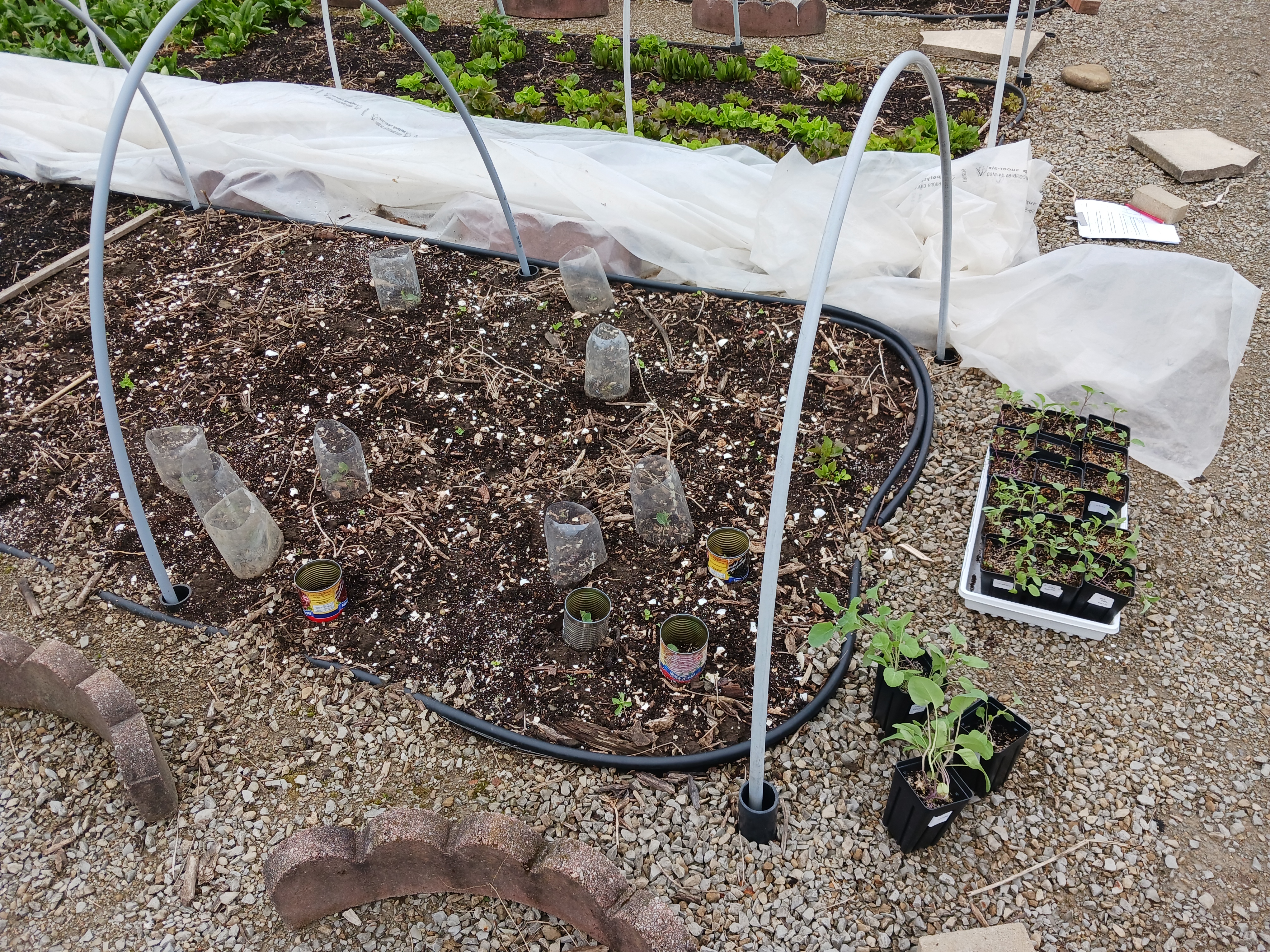 The above photo shows the cauliflower bed at the end of April. Of the 72 plants that went in in the middle of March, the dozen survivors have been collared with tin cans or plastic pop bottles to allow me to keep track of them. The second batch of seedlings went in right after I took the photo.