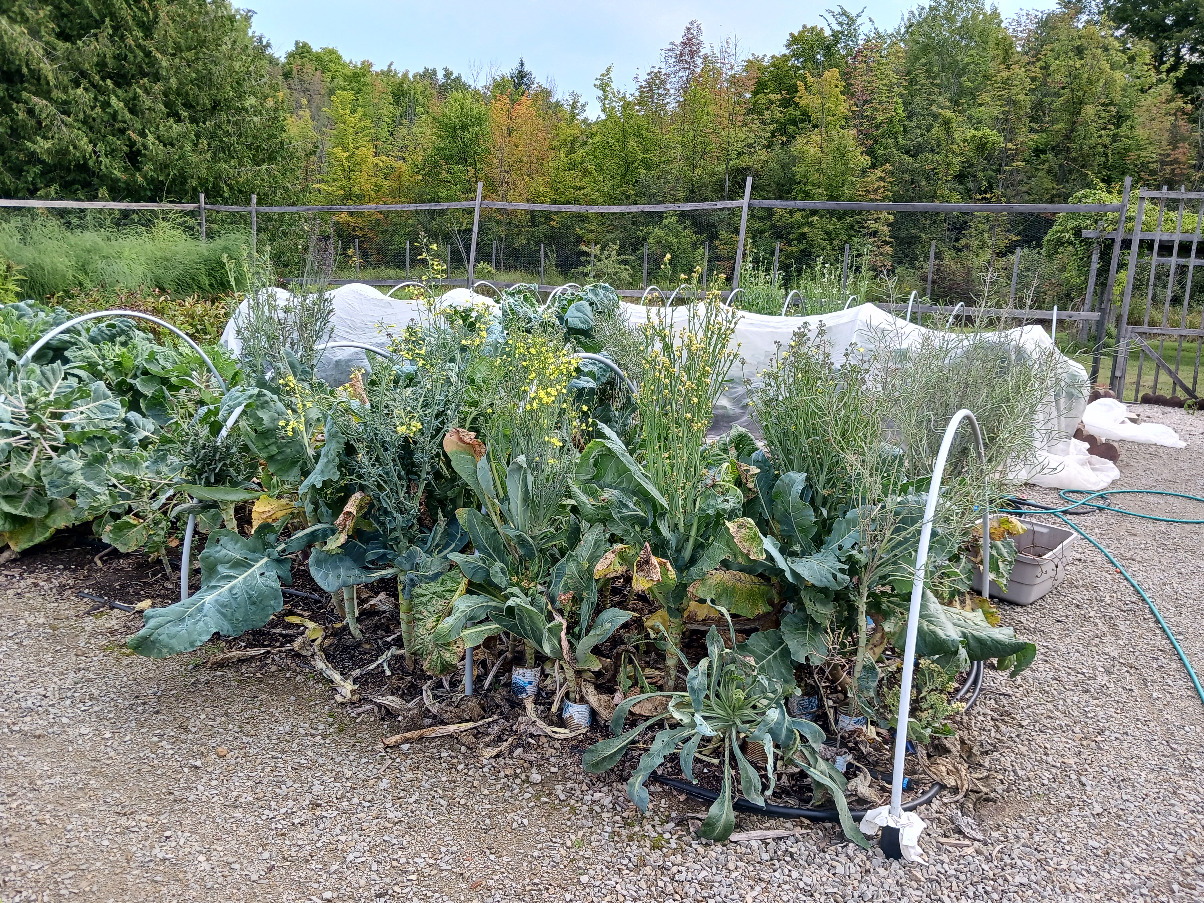 Here are the cauliflowers in mid-September. I was able to collect a decent quantity of seed from 4 plants. Three of them were winter survivors. However, I do not conclude that being a winter survivor increased the chances of producing seeds. They were all from seedlings of the variety Pusa Meghna, the only cauliflower we have previously been able to save seed from. The last plant we got seed from was neither a winter survivor nor Pusa Meghna - it was either Goodman or Early Snowball. I jammed then in so closely together in order to maximize the number of potential parents that I was unable to keep track of the rows once they started flopping around.