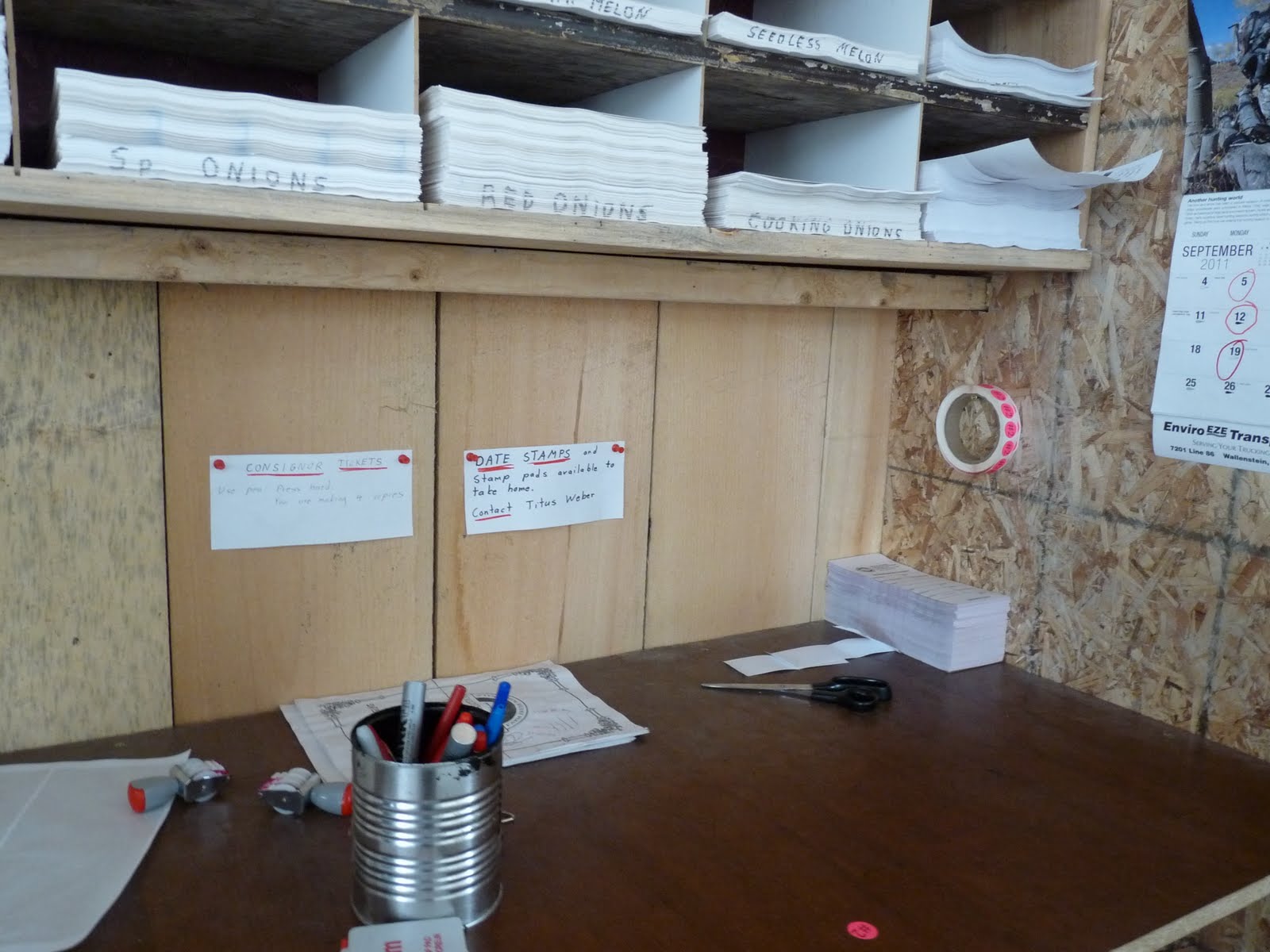 There is a section walled off from the main area, which is full of packaging materials. Vendors take what packaging they need, and write the amount taken down in a notebook. Once a month, they are billed for the packaging materials they have taken. This keeps the produce in consistently sized lots from one vendor to another, and allows purchasers to get a similar product no matter who the vendor was, in quantity at least.