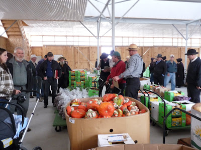 I was chatting to a man (as we both hung over a bin of delicious-smelling melons taking up the scent for free) who told me that these auctions are becoming very popular with Mennonite farmers, and that there are somewhere around 100 such auctions in the United States now. They are an effective way for Mennonite farmers, who are restricted in how far they can reasonably travel by buggy or wagon, and who often don't have large quantities, to get their produce to distributors. It's more practical for the distributors too, than travelling from farm to farm, often for fairly small quantities.