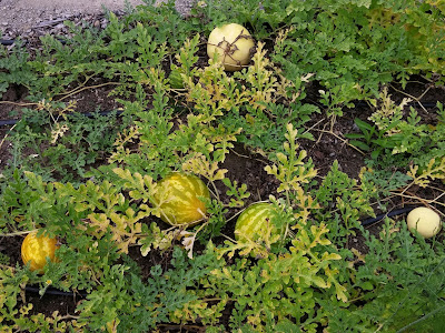 Watermelons are another one that have been very frustrating. We've given up on trying to breed a better yellow-when-ripe watermelon than Golden Midget. While I think we did breed a better one - larger melon, smaller seeds, thinner rind, better texture - the taste continued to be only so-so. However, the project kept throwing green melons with much better flavour. We decided to grow out the ones we had saved of those green ones (usually for exceptionally good taste) and look for a small, early watermelon with the all the qualities we wanted except the golden rind. Because the golden rind gene is recessive, we expect to be filtering that out now for a few years to come.