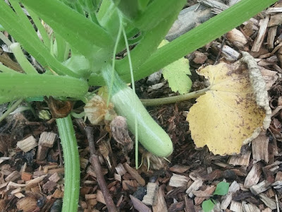 This one is a perfectly nice little zucchini, as far as I can tell, with a perfectly nice little compact but open bush. We have gotten a few zucchini from it, but it has by no means been prolific. As I've noted before this has been a tough, tough summer for the cucurbits in general. This one has struggled along, not an absolute failure but not standing out for having what it takes to succeed in the face of adversity either. Looking for info on it online, I see one grower describing it as a shy bearer, so it may not just be the weather. Other people - people selling seeds, to be sure - describe it as prolific. Mm. Okay.
