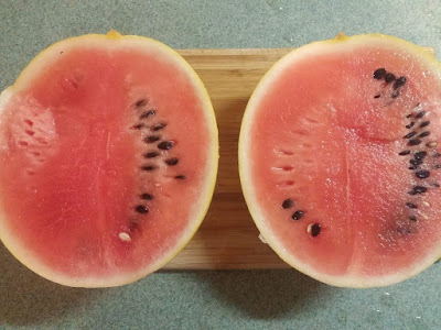 Our watermelon project continues. I appear not to have posted an update last year; bad me! I feel like we've made a lot of progress, but we just aren't there yet. We planted only seeds from yellow-when-ripe watermelon this year, but we got some green skinned ones too. It's just a matter of time to sift them out, since the green skins are dominant, and once there are none, it will mean that gene is out. However, since we can't tell until the fruit ripens, they are still casting out their pollen. It sure slows us down on getting them out.