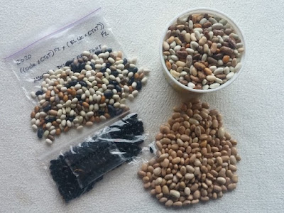 On the top left are the seeds I'm keeping to try again, from a number of plants. These were the most disease resistant and reasonably productive ones, and they are mostly small and round like navy beans. I did keep one larger, flatter one just because it had such an unusual slate-blue colour. It looks black in the photo but it really is not. The ones in the tub were the rejects, which will be eaten this winter.