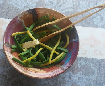 Wash, trim, and cut the yellow wax beans in half. Wash and trim the garlic scapes, keeping only the tender stems. Cut them in pieces of about the same size as the beans. Leave them in a colander and scald them by pouring a little boiling water over them. Drain well.
